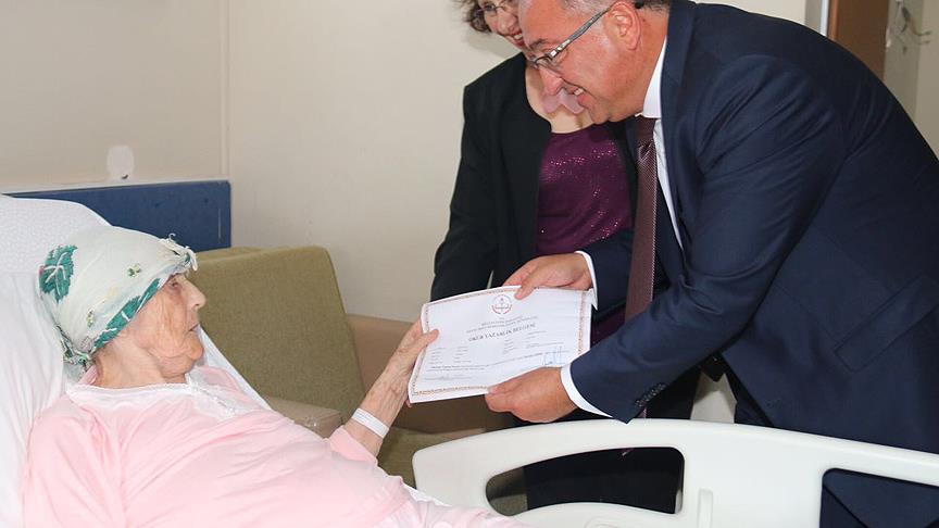 Yalova Belediyesinden yapılan yazılı açıklamaya göre, Yalova Belediyesi Umut Merkezleri bünyesinde Bahçelievler Mahallesi’nde açılan okuma yazma kursuna katılan Göre, 4 ay devam eden kursları hiç aksatmadı. Göre, sertifikasını geçirdiği rahatsızlık nedeniyle hasta yatağında Yalova Belediye Vefa Salman'ın elinden aldı.