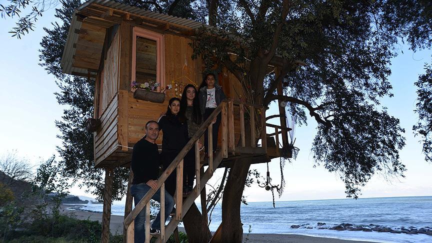 Tiryaki, bahçesindeki zeytin ağaçları arasına 12 metrekarelik ahşap ev inşa ederek deniz manzarası eşliğinde doğal ortamın tadını çıkartıyor.