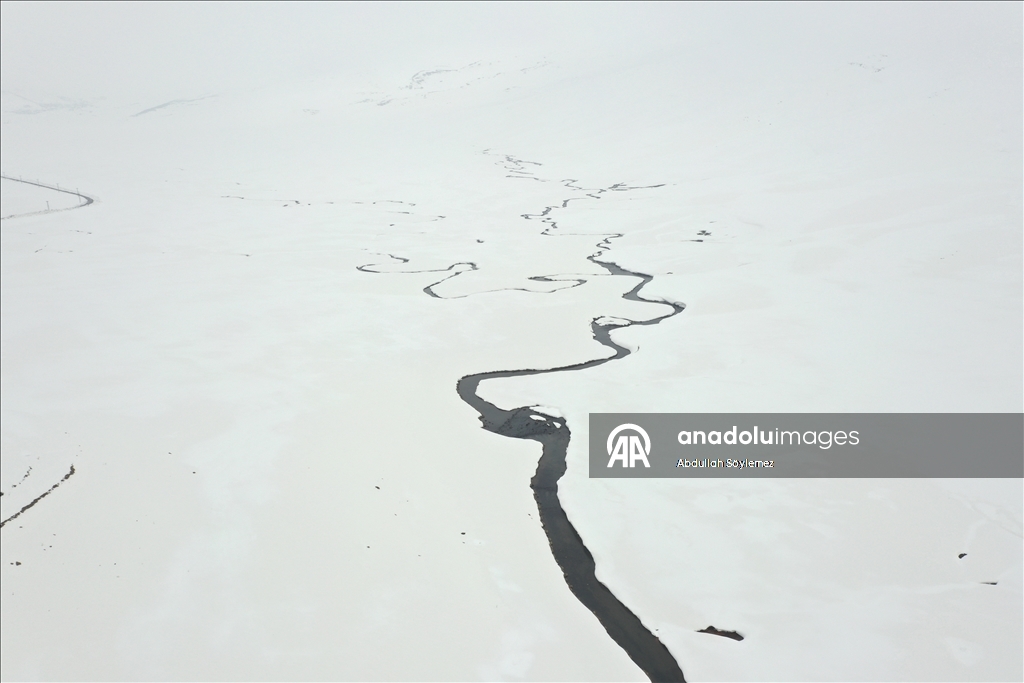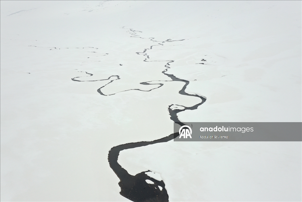 Kilometrelerce uzunluktaki menderesler ve çevresindeki karlı dağlar, dronla görüntülendi.