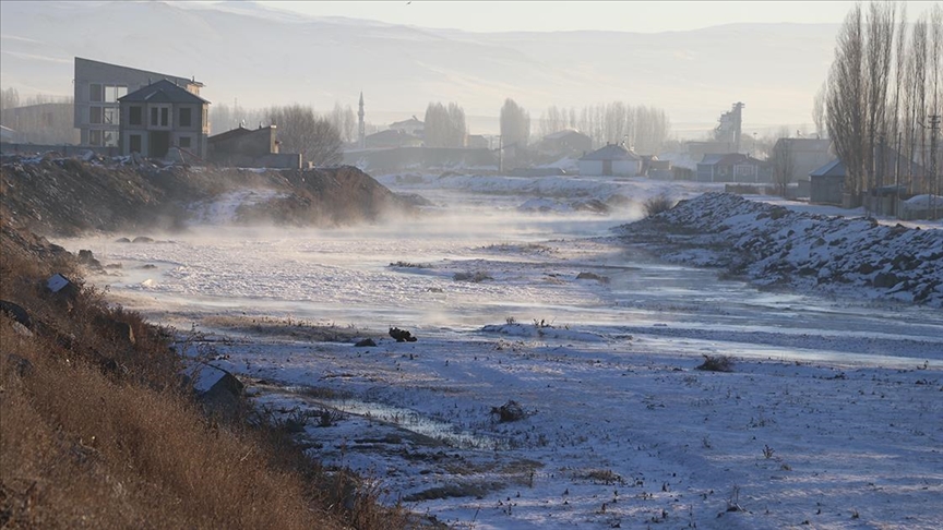 İl merkezinden geçen Murat Nehri de kısmen buz tuttu. Nehrin yüzeyinden çıkan buhar ve buz kütleleri dronla görüntülendi.