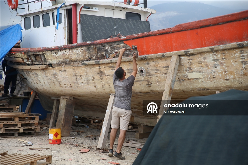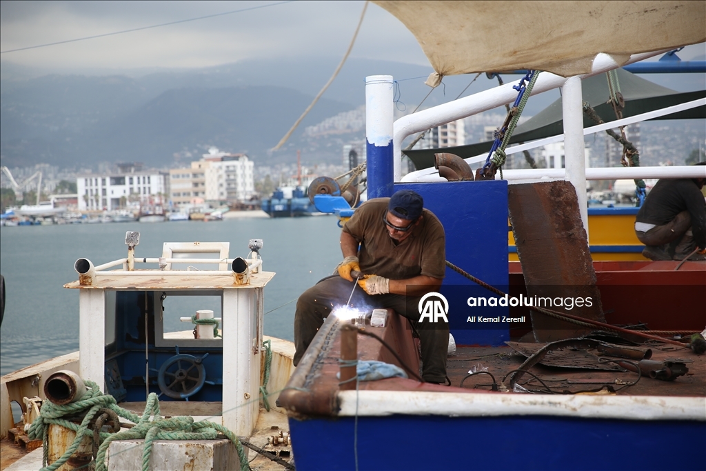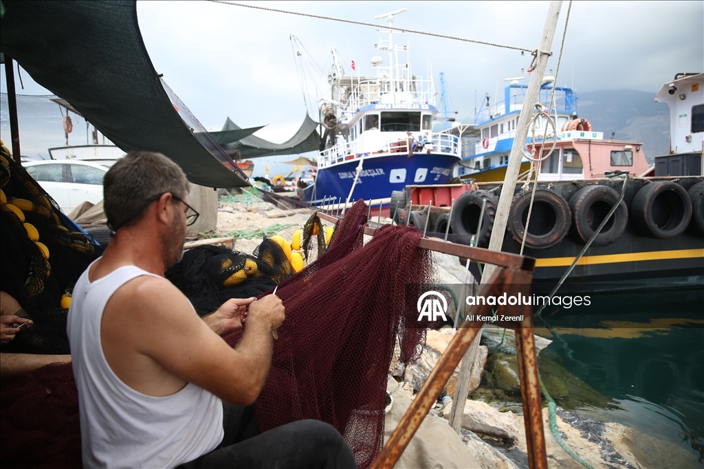 Av yasağının 16 Eylül'de sona ereceği Akdeniz'de balıkçılar, "vira bismillah" diyebilmek için ağlarını onarıyor, teknelerinin bakımlarını yapıyor.