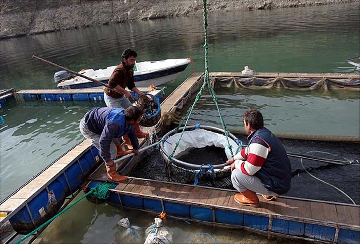 Adaptasyon işleminin ardından, yavru alabalıklar, tanklardan hortumlar yardımıyla yeni ağ takılan kafeslere nakledildi.