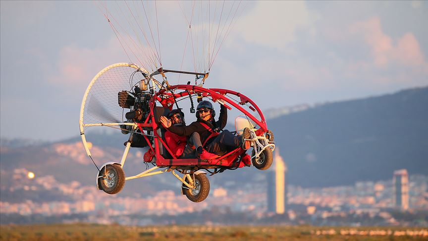 Pehlivan ve Var'ı taşıyan motorlu yamaç paraşütü, 30 dakika boyunca 200 metre yükseklikte İzmir semalarında tur attı.