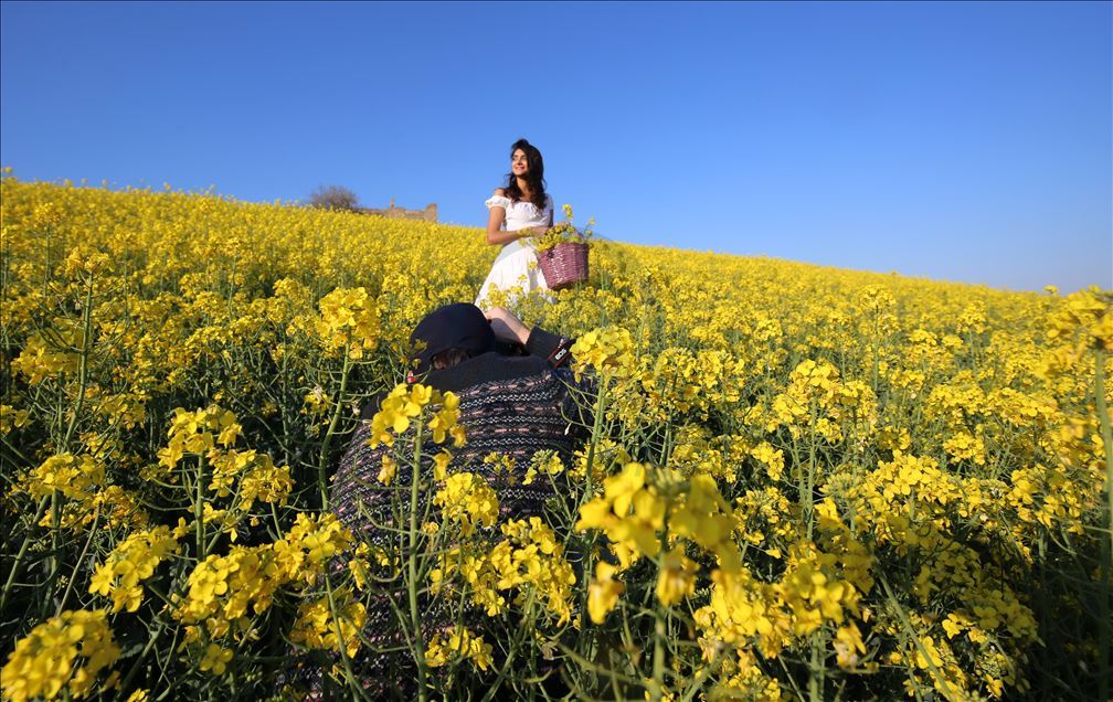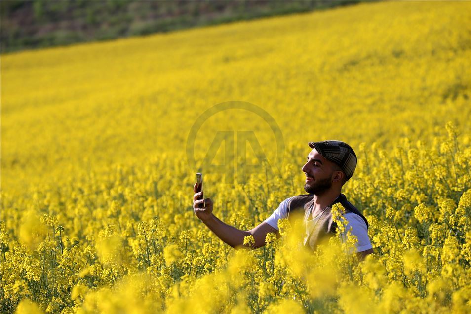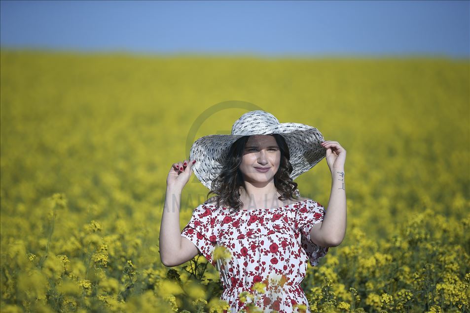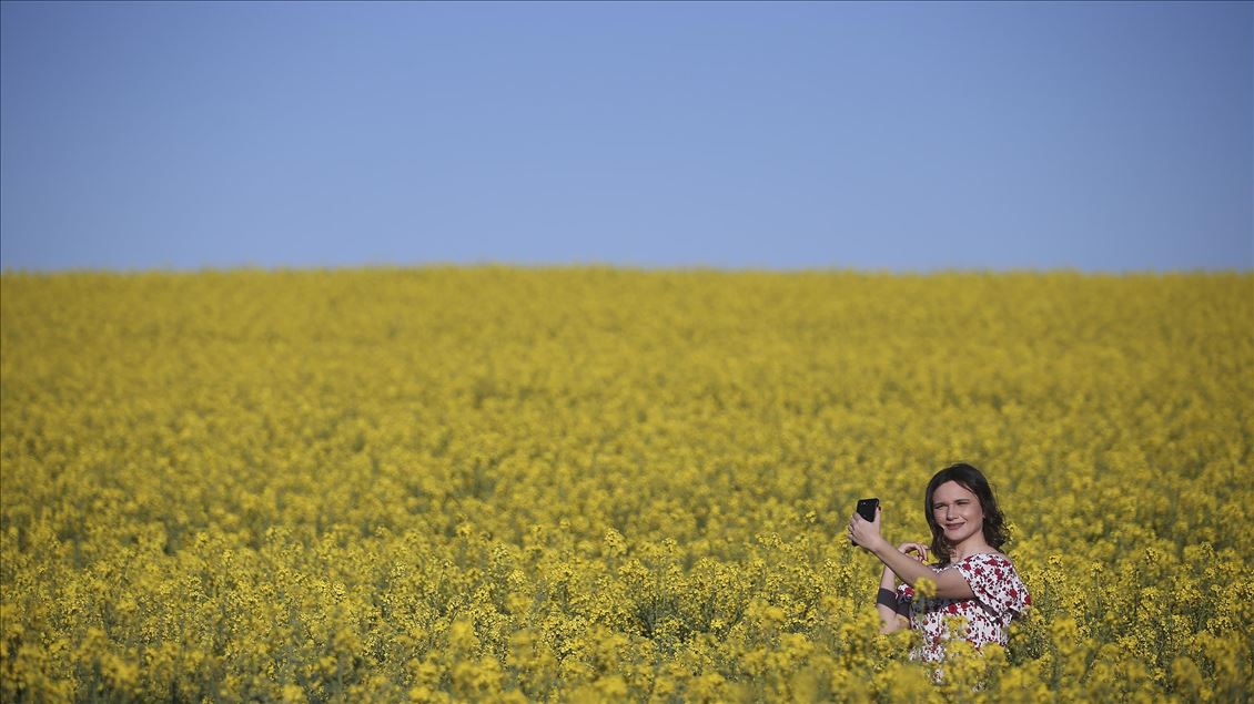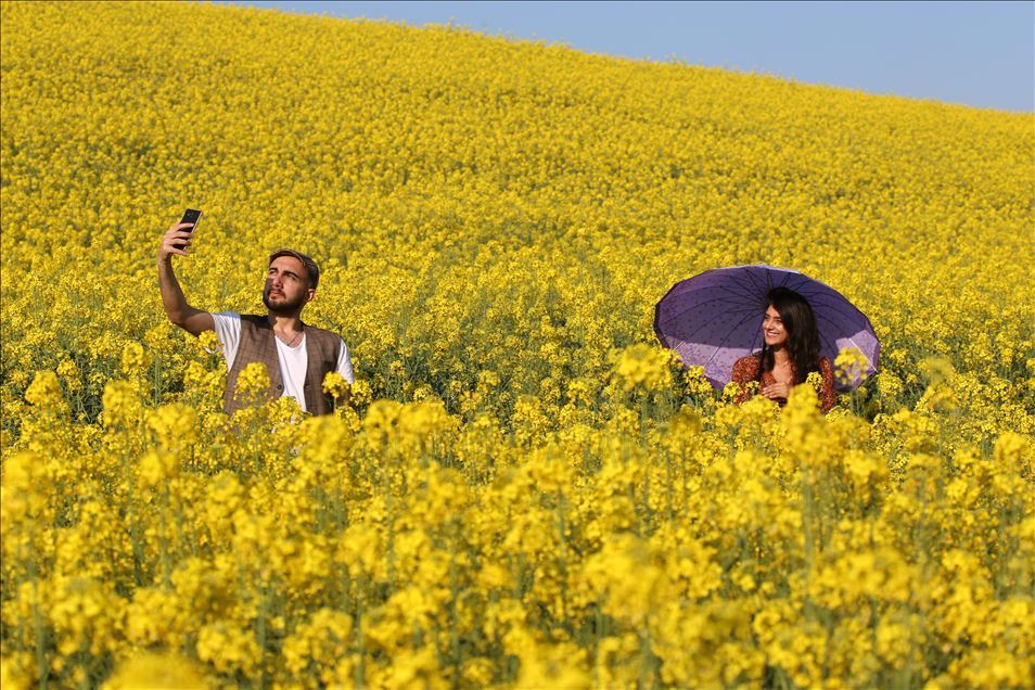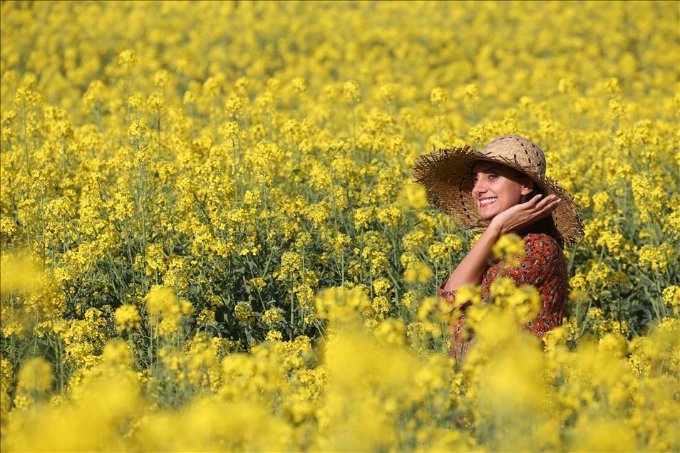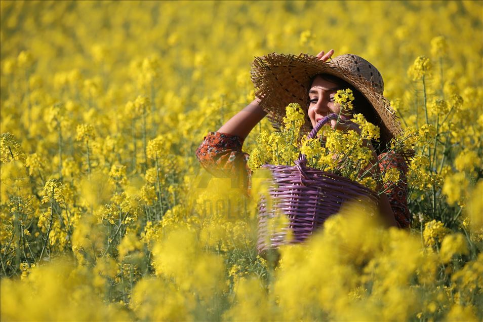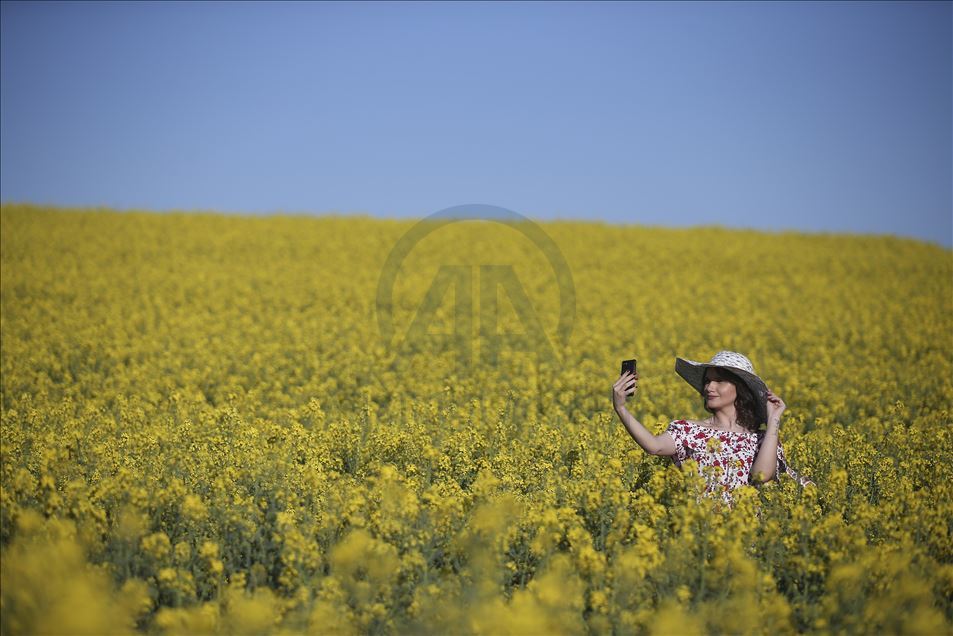 Ayçiçeğinden önce tarlaları sarıya boyayan kanola rengiyle göz kamaştırıyor ve kahverengi toprağı bir halı gibi örten sarısıyla güneşi çağrıştırıyor.