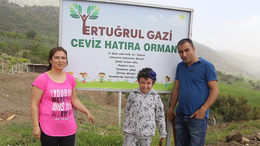 Aile, Kozan ilçesine bağlı Henüzçakırı köyünde 15 dönümde 320 fidanla kurulan ceviz bahçesine oluşturdukları "Ertuğrul Gazi Ceviz Hatıra Ormanı"nın tabelasına "O daha on birinde bir fidandı / Annesinin babasının dalıydı / Şimdi orman oldu / Kuşlara yuva / İnsanlara gölge / Evrene oksijen/ Sevenlerine hatırası kaldı." ifadelerini yazdırdı.