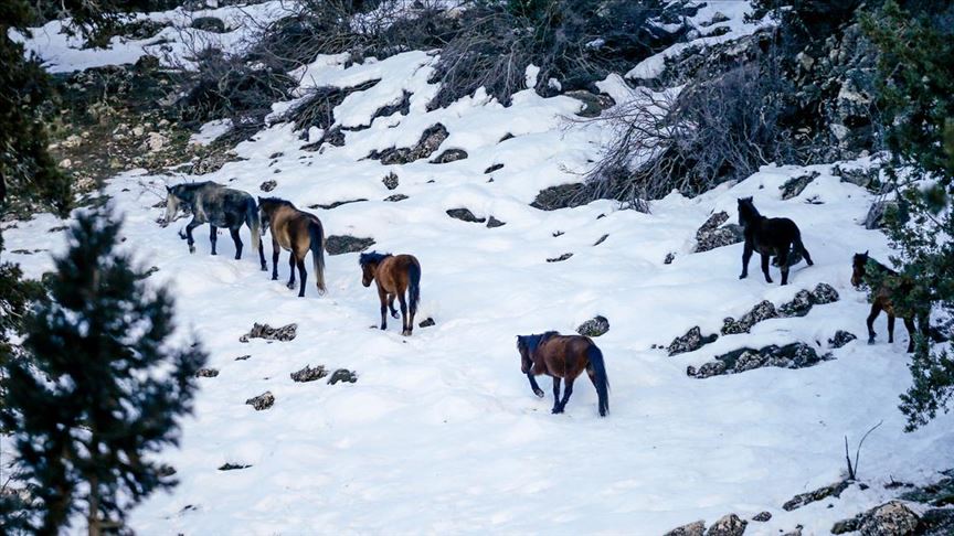 Antalya'da Beydağları'nın yüksek kesimlerindeki ormanlık alanda yaşayan yılkı atları, karın beyaza bürüdüğü yaban hayatında yiyecek ararken görüntülendi.