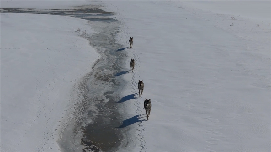 Dereyolu köyü yakınlarında yiyecek arayan 4 kurt, AA ekibi tarafından dronla görüntülendi.