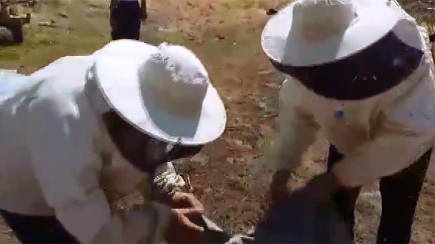 Gülderen'in bu durumunu görenler, olduğu yerde hareketsizce bekleyen komşularını kurtarmak için bir süre çabaladı. Özel tulumlarını giyen köylüler, oğulu koyabilmek için Gülderen'in yanına önce bir kovan getirdi.