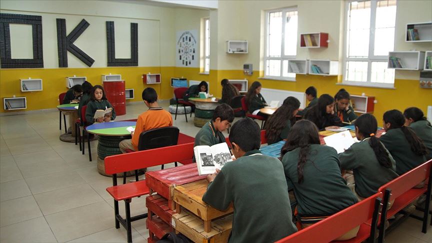 Aşağı Mollahasan Mahallesi'ndeki Şehit Aydın Muştu Ortaokulu öğrencileri, geçen kasım ayında çevrelerinden lastik, sebze kasası, pet şişe, evlerinin yakınlarındaki marangozlardan ise tahta ve kutu gibi geri dönüşüm malzemeleri topladı. Öğrenciler, öğretmenlerinin de desteği ile okulun bir sınıfında bu malzemelerle kütüphane oluşturdu.