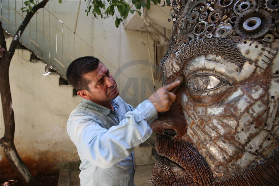 Hatay'ın Reyhanlı ilçesinde yaşayan mozaik ustası Mervan Altınorak, çevre kirliliği konusuna dikkat çekmek için hurda otomobil, tır, kamyonet, traktör ve motosikletlerden topladığı 50 bin parçadan 500 kilogramlık 2,5 metre boyunda insan portresi yaptı. ( Cem Genco - Anadolu Ajansı )