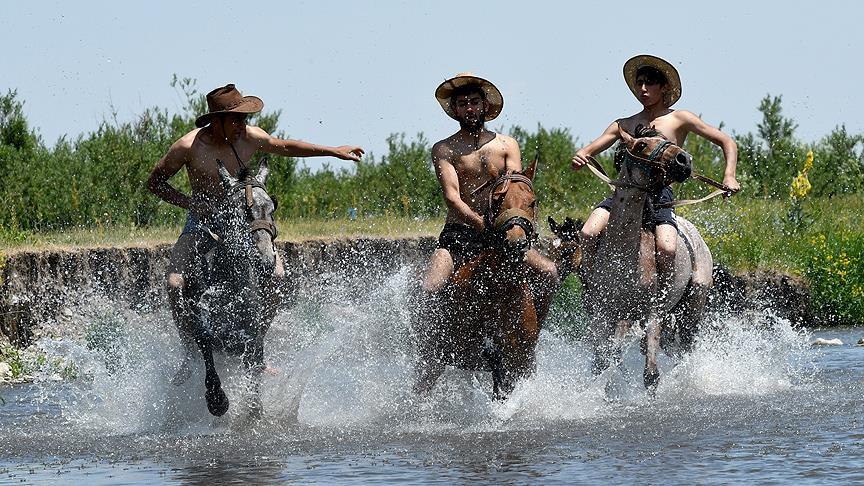 Güneşten etkilenmemek için fötr şapka takan gençler, köyün 500 metre yakınından geçen derenin yaklaşık 1,5 metrelik kısımlarında yüzdürdükleri atlarına, daha sonra dere boyunca kısa koşular yaptırıyor.