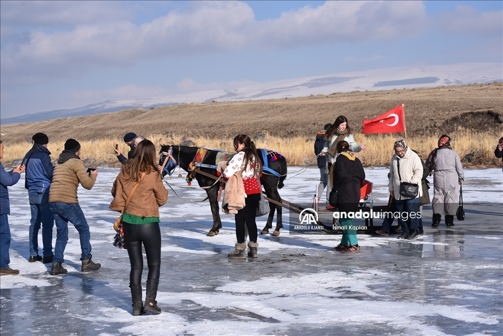 Bölgeyi ziyaret eden turistler, atlı kızaklara binip hatıra fotoğrafı çektirdi, buz üzerinde yürüyüş yaptı.
