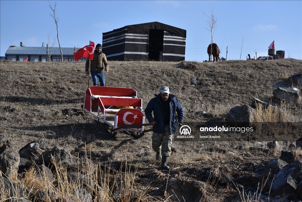 Atlı kızakçılar, soğuk havanın etkisiyle kısmen donan Çıldır Gölü'nün buzlu yüzeyine çıkmaya başladı.
