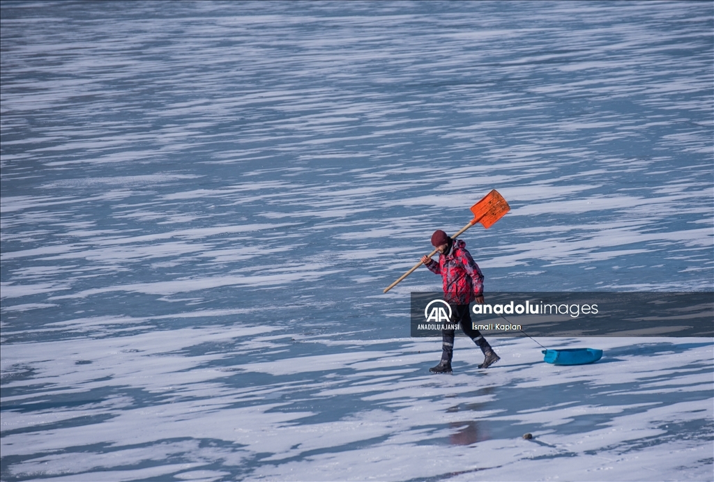 Gölün, Kars'ın Arpaçay ilçesine bağlı Taşbaşı köyü mevkisindeki kıyısında buz kalınlığı 10 santimetreye ulaştı.