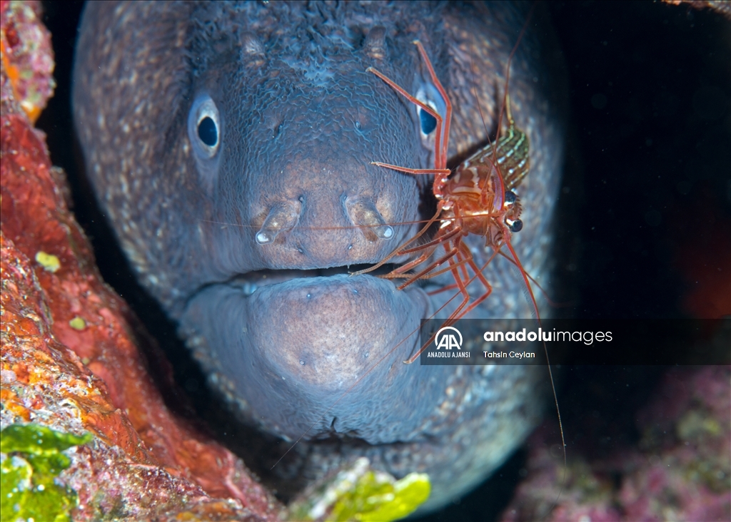 Ayvalık'ta müren balığı ile karidesin simbiyotik ilişkisi kameralara yansıdı