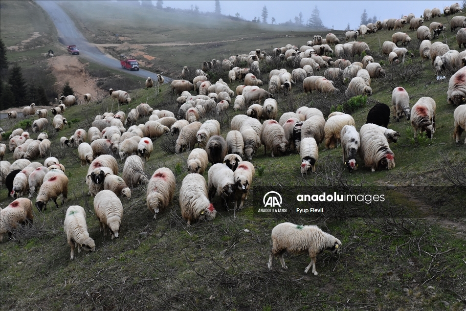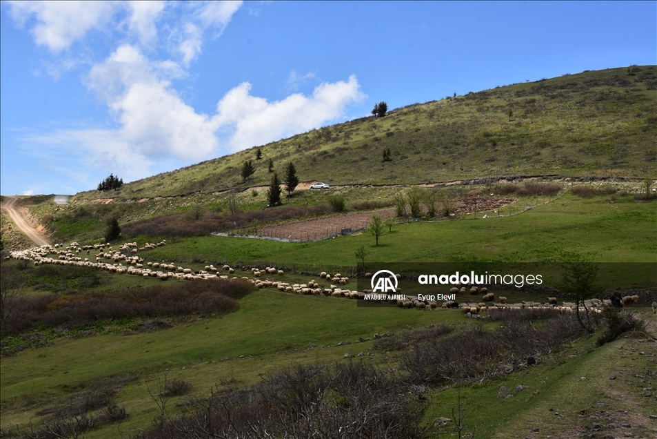 Baba mesleğini devam ettiren çobanlar, yaklaşık bin 350 hayvanın bulunduğu sürülerinin eşliğinde, yeşilin her tonunu barındıran orman çevresi ile çayırlar ve yollardan geçiyor.