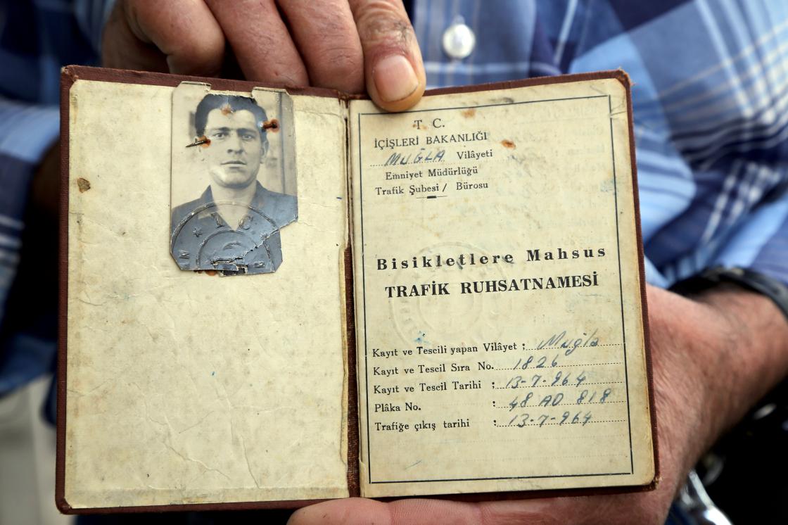 Muğla'da 72 yaşındaki Şener İnce, zamanında birçok kez muayenesinin yapıldığını gösteren damga pulu bulunan ruhsatlı ve plakalı babasının emaneti bisikleti, halen ulaşım aracı olarak kullanıyor.