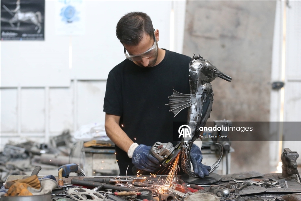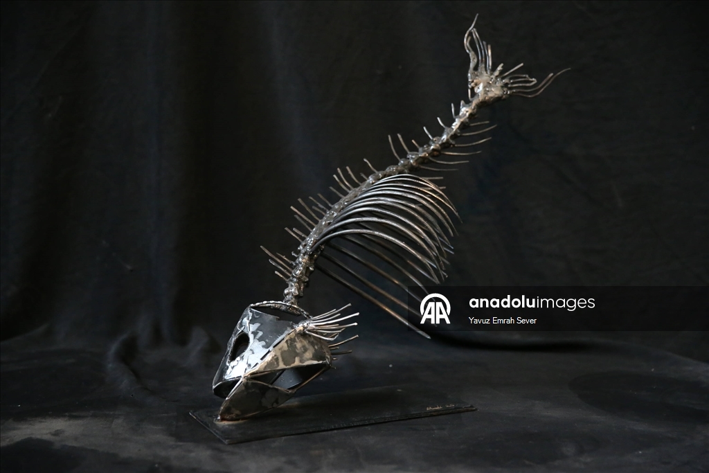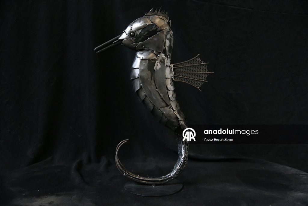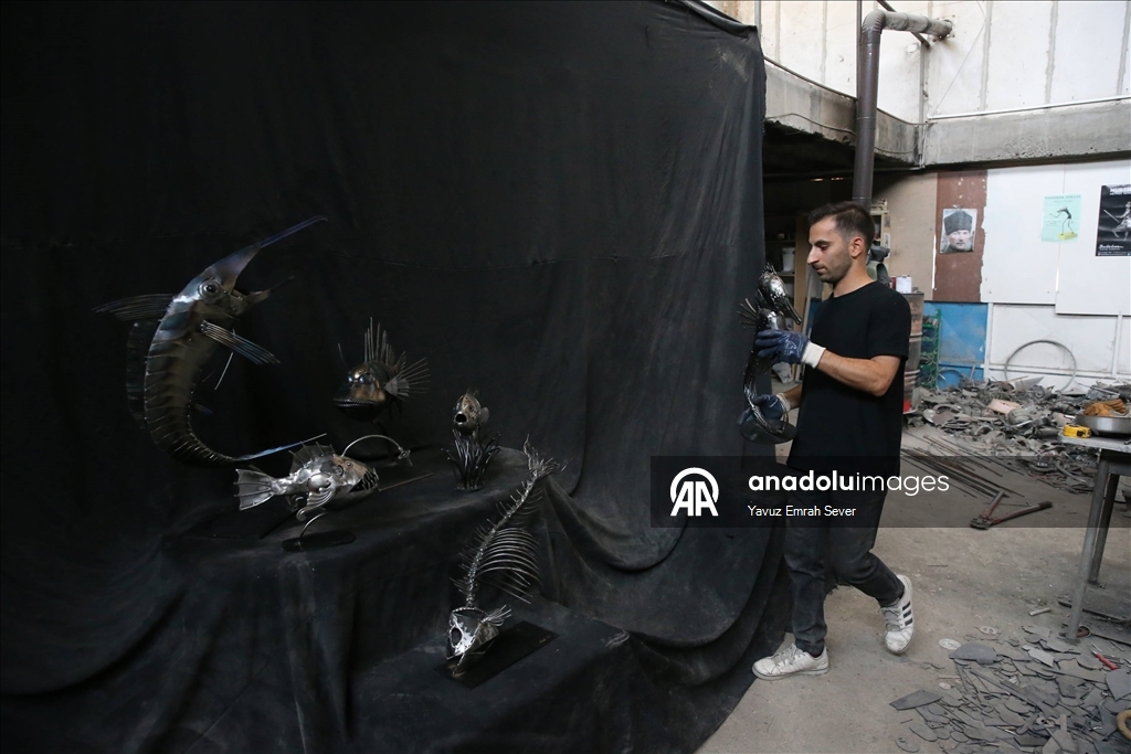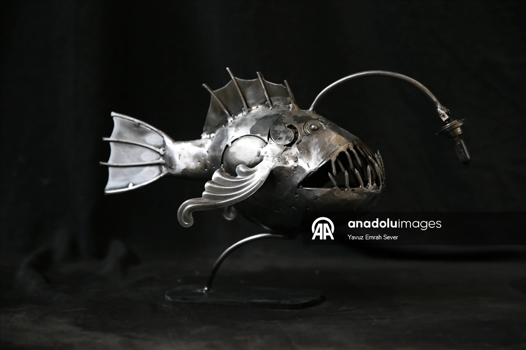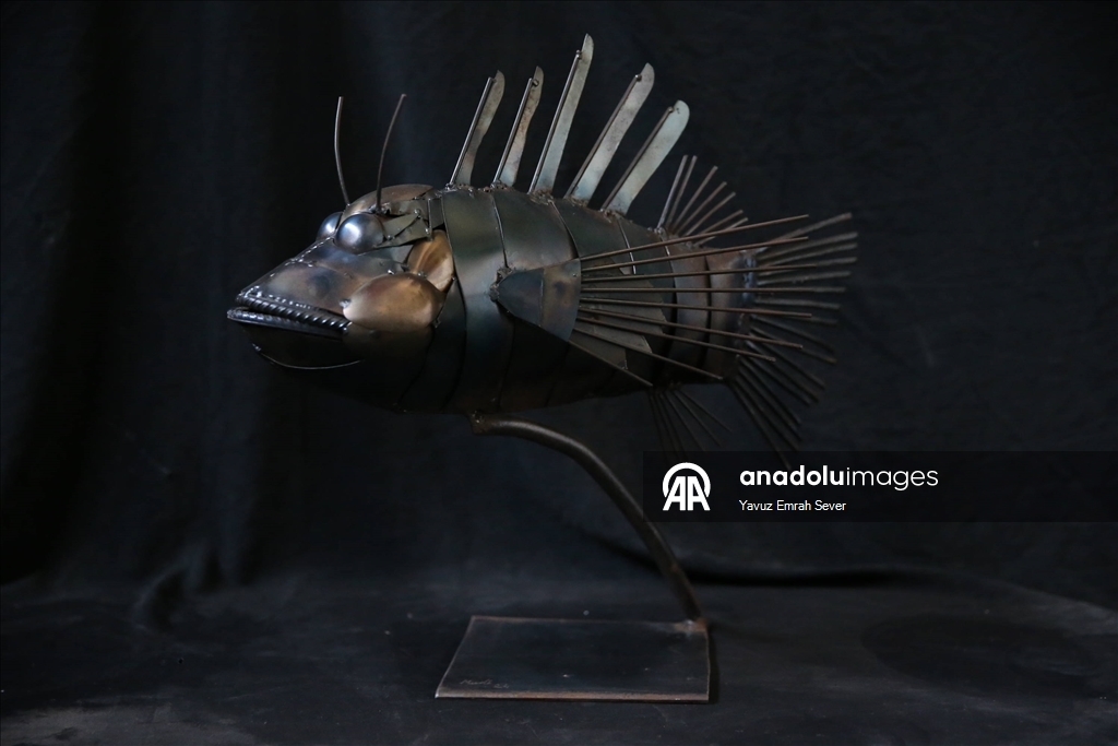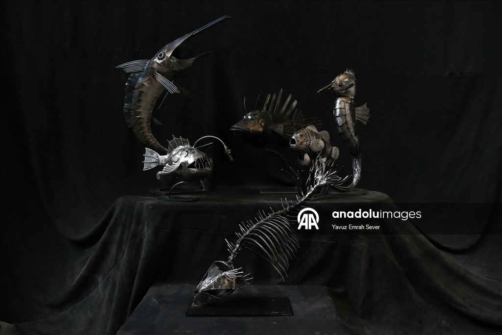 Eskişehir'de yaşayan metal heykel sanatçısı 22 yaşındaki Mücahit Diyar Arız, baba mesleği olan balıkçılıktan ilham alarak hurda metalleri kullanarak deniz canlılarının heykellerini oluşturdu.