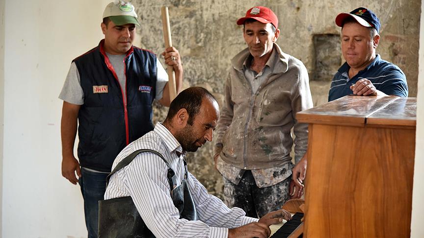 Eğirdir Belediyesinde su arıza biriminde işçi olarak çalışan Mevlüt Demiralay, arıza nedeniyle yanında kazı yaptıkları eski kilisedeki piyanoyla mini dinleti sunuyor.