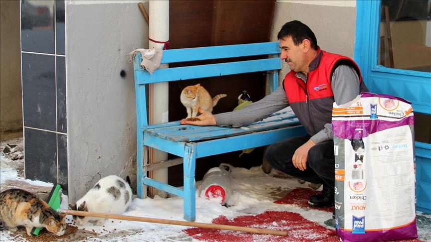 Sivas'ın Suşehri ilçesinde bir berber, ağır kış şartlarında yiyecek bulmakta güçlük çeken sokak hayvanlarının karnını iş yerinin önünde hazır mama ile doyuruyor.