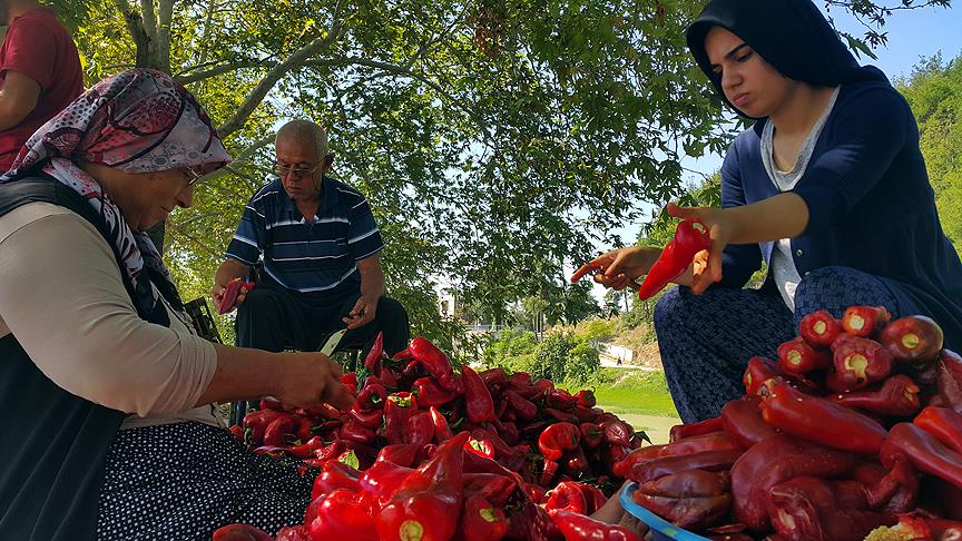 Daha sonra seyyar ya da sabit biber çeken yerlere götürülen kırmızı biberler, kilogram başına ödenen belli bir ücret karşılığında çekiliyor.