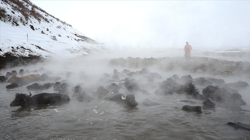 Sıcak suyun hayvanlara iyi geldiğini, verimlerinin arttığını belirten Azbay, "Soğuk hava gebe olan mandalara zarar veriyor. Bu nedenle daha çok havanın güneşli olduğu günlerde geliyoruz. 20 mandamız var. Onları yıkayıp temizliyoruz. Köyümüzde bin manda var. Bu nedenle belli aralıklarla geliyoruz." dedi.