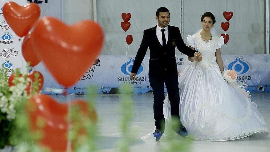 Sultangazi Belediyesi tarafından 14 Şubat Sevgililer Günü dolayısıyla 10 çiftin nikahı, belediyenin buz pistinde kıyıldı.