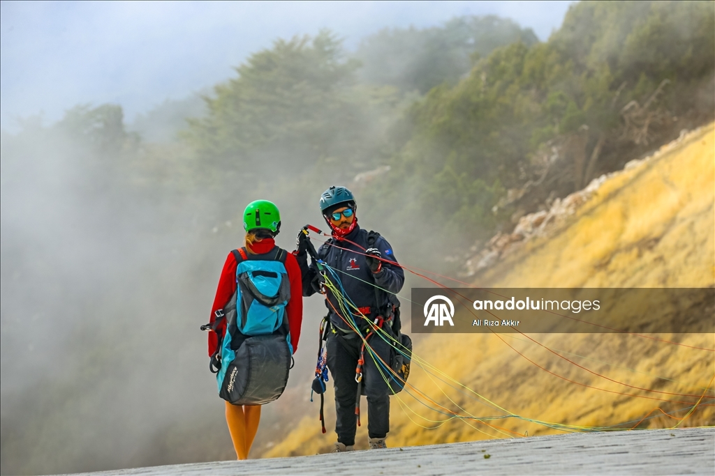 "Altın Hafta" olarak adlandırılan 1-7 Ekim'deki tatilde Türkiye'ye gelen Çinli turistler, yamaç paraşütü uçuşu yapmak için Ölüdeniz Mahallesi'ndeki Babadağ'a çıktı.