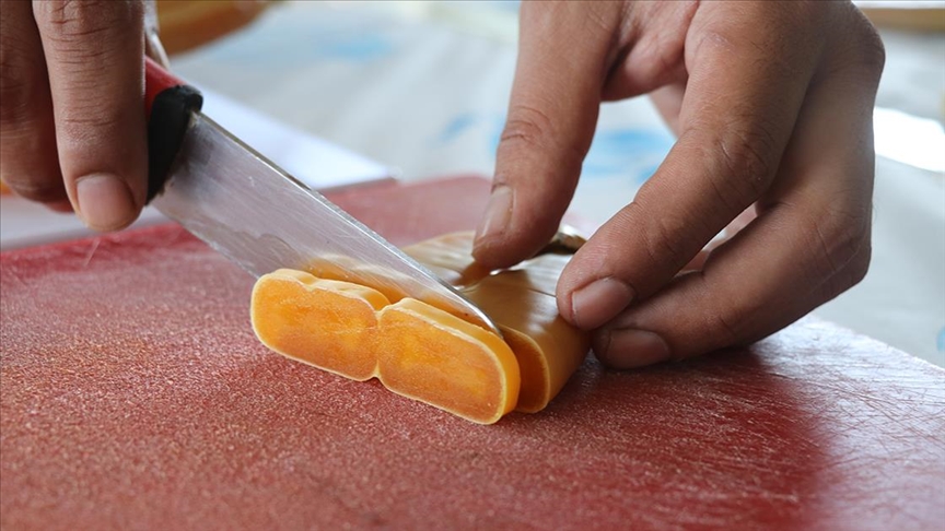 AA Canlı Bottarga, dişi kefal balığından çıkartılan havyarın, temizlenip kurutulması gibi zahmetli bir sürecin ardından uzun süre dayanması için bal mumuyla kaplanmasıyla hazırlanıyor.