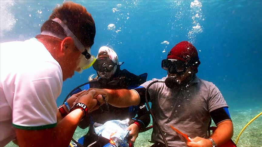 Gencin parayı veren dalgıca sarılması, renkli görüntüler oluşturdu. Bir dalgıç da "Mutlu Bayramlar" yazılı döviz açtı.