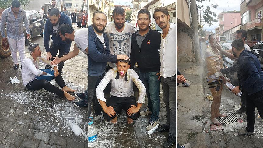 Arkadaşlarının damada yaptıkları şakalarla renkli görüntüler ortaya çıktı. Gelin alma sırasında 25 yaşındaki damat Mustafa Ünal'ın kafasında yumurtalar kırıldı, başından aşağıya un döküldü.