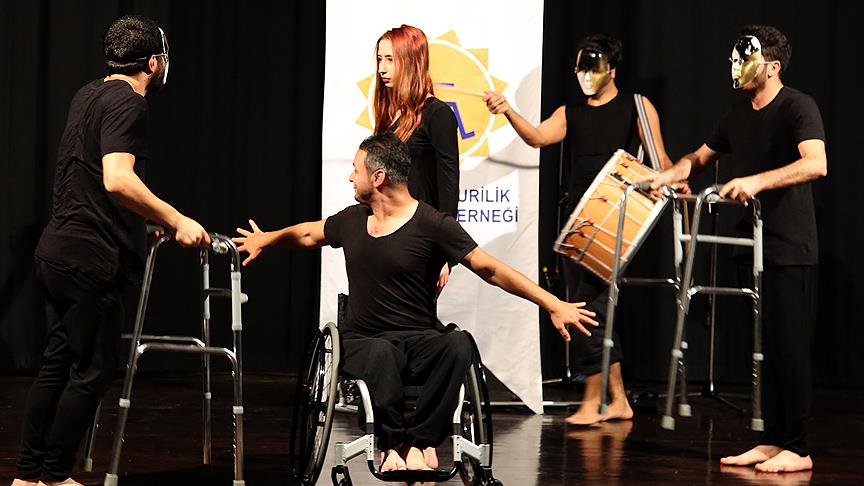 Türkiye Omurilik Felçlileri Derneği (TOFD) Sanat Atölyesince sahnelenen "Rüya ve Maskeler" gösterisinde sahne alan engelliler, dans ederek engellerini aşmaya çalışıyor.
