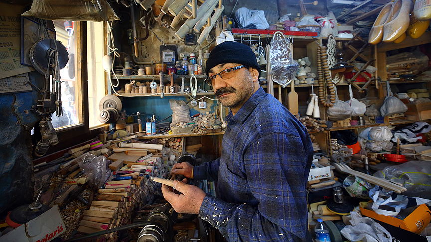Eskiden yaygın kullanılan tahta kaşık, oklava gibi çeşitli ahşap eşyaları yapan çıkrıkçılardan biri de Ahmet usta.