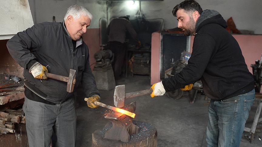 Dedesiyle 28 yıl örs üzerinde çekiç salladığını ifade eden Koç, "Dedemle karşılıklı çok çekiç vurduk, yaklaşık 20 yıl çıraklık yaptım, 30 senedir ustayım. Kendimi yetiştirdim. Çok çalıştık, bunun okulu yok. Dedem bize öğretti. Bu sanat aslında çok zor, kolay değil." dedi.