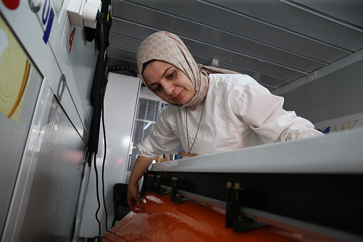 Hatay'ın İskenderun ilçesinde 6 Şubat 2023'teki depremlerde promosyon ürün ve tabela tasarladığı iş yeri yıkılan 36 yaşındaki reklamcı Gülbahar Uzun, Ahi Evran Konteyner Sanayi Sitesi'nde tahsis edilen atölyede mesleğini sürdürme fırsatı buldu.