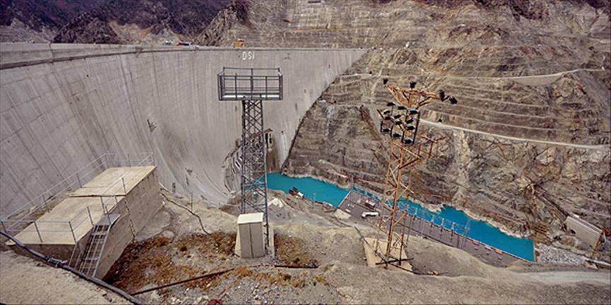 Bakan Eroğlu, sahip olduğu 249 metre gövde yüksekliği ile kemer baraj sınıfında Türkiye'nin birinci; dünyanın da 6. en yüksek beton kemer barajı olan Deriner'de su tutmaya başlayan baraj bölgesinde DSİ Genel Müdürü Akif Özkaldı ile incelemelerde bulundu.