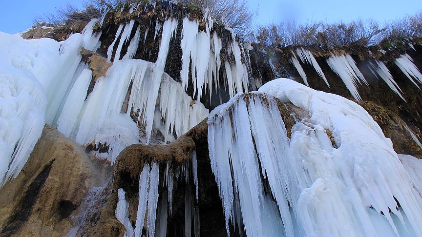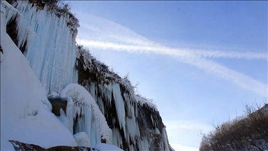 Sivas'ın Doğanşar ilçesindeki Dipsiz Göl Şelalesi, bölgede etkili olan soğuk hava nedeniyle buz tuttu.