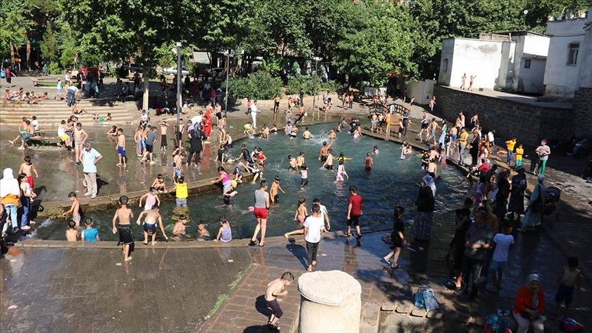 Kentte bazıları park ve bahçelerdeki gölgelik alanlarda, çocuklar da Anzele'deki süs havuzlarında serinlemeye çalışıyor.