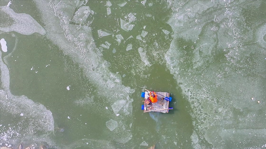 Kelek üzerinde balık tutan balıkçılar, göl kenarında avlanan balıkçıl kuşlar ve kızıl tilkinin beyaz örtü altında tarla faresini yakalama telaşı ise dronla görüntülendi.