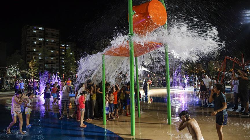 Paten kayılan, bisiklet sürülen meydanda geç saatlere kadar çocuk sesleri yankılanıyor. Parka hazırlıklı gelen aileler su ile oynarken giysileri ıslanan çocuklarına, yanlarında getirdikleri yedek kıyafetleri giydiriyor.