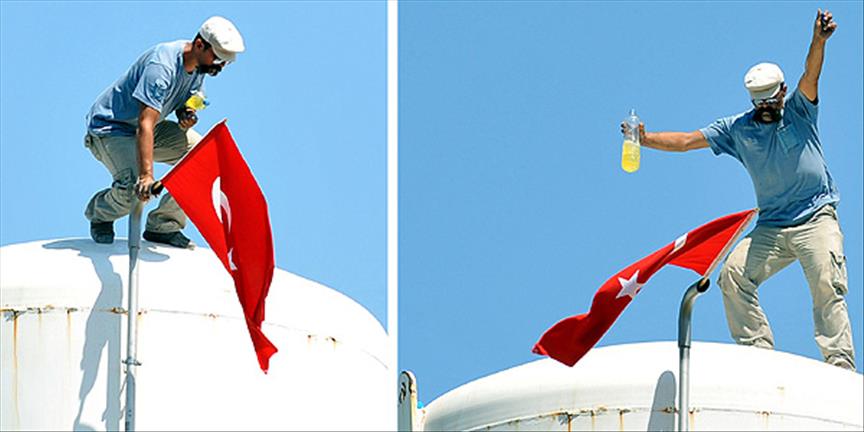 Kendisini ikna etmek için merdivenle tanka çıkan itfaiye ve polis ekiplerine sinirlenerek cep telefonunu aşağı atan İbrahim Ö, tankta bulunan Türk bayrağını da alarak ''Türk bayrağıyla öleceğim'' dedi.