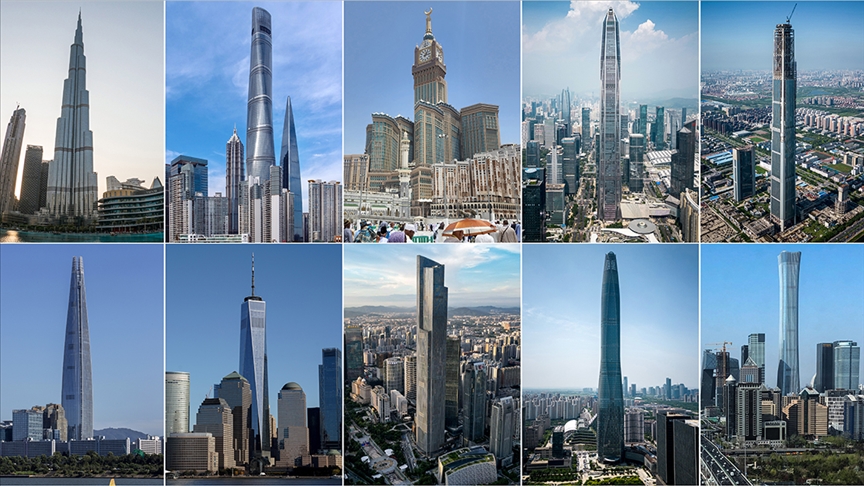 Dünyanın en yüksek 10 binası olan Burj Khalifa, Şangay Kulesi, Kraliyet Saat Kulesi, Ping An Uluslararası Finans Merkezi, Goldin Finance 117, Lotte World Tower, Guangzhou CTF Finans Merkezi, One World Trade Center (Özgürlük Kulesi), Tianjin CTF Finance Center ve China Zun gökdeleni görüntülendi.