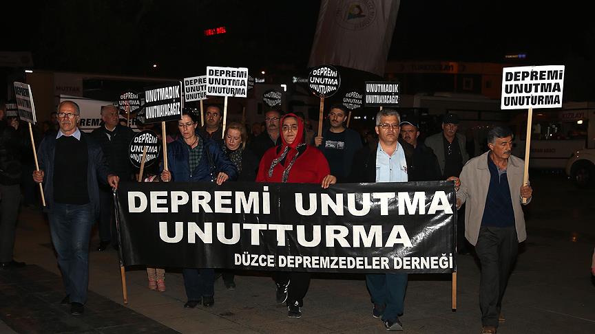 Ellerindeki, ''Depremi unutmadık, unutturmayacağız'' ve ''Sağlam binalar istiyoruz'' yazılı dövizleri taşıyan Düzce Depremzedeler Derneği (DEPDER) üyeleri ile vatandaşlardan oluşan grup, Atatürk Anıtı'na kadar yürüdü.