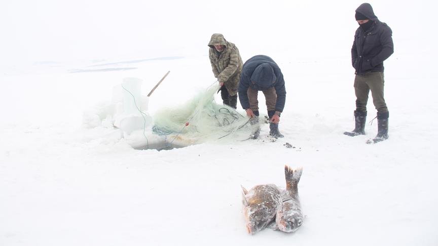 Balıkçılar, buzu motorlu testerelerle kesip suya ağlarını atıyor. Buz altından çıkardıkları, halk arasında sarı balık denilen tatlı su sazanlarını göl kenarında bulunan restoranlarda pişiren köy halkı, geçimlerini sağlıyor.