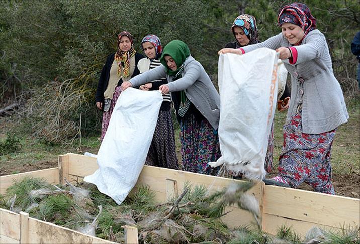 Çam ağaçlarının uç kısımlarında kış boyunca oluşturdukları keseciklere yumurtlayarak ağaçlara zarar veren çam kese böcekleriyle mücadele eden Yığılca Orman İşletme Müdürlüğü ekipleri, mekanik mücadelede kadınlardan yararlanıyor.