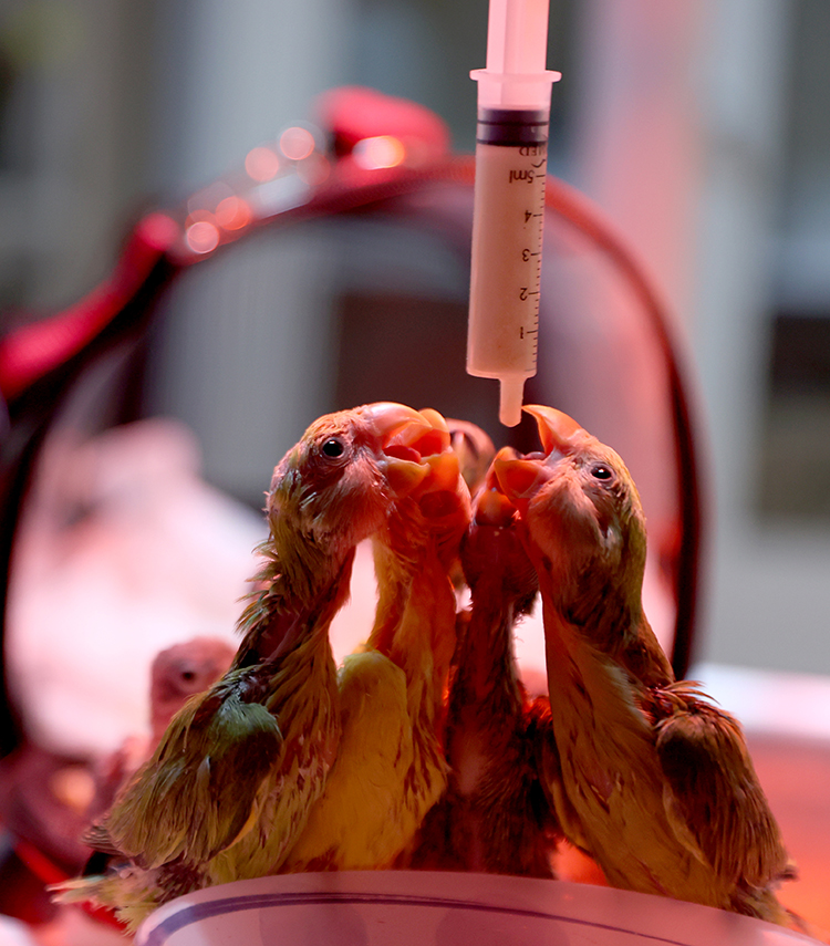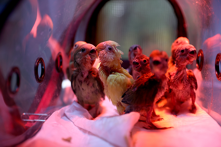 Uygun ışık ve sıcaklık değerlerinde tutulan ve 5 saatte bir şırınga aracılığıyla özel mamalarla beslenen papağan yavrularının tüyleri çıkmaya başladı.