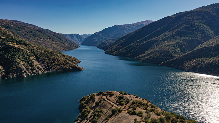 Fırat Nehri üzerinde kurulu Karakaya Baraj Gölü'nün Elazığ, Diyarbakır ve Malatya sınırlarının kesiştiği noktadaki uzantısı, dronla görüntülendi.