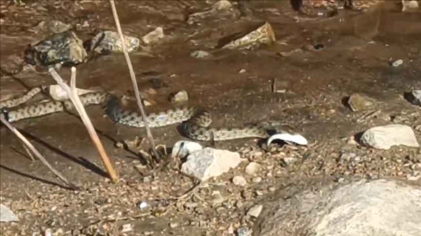 Görüntüde, yılanın avladığı balıkla karaya çıkması, bir süre sonra gözden kaybolması yer alıyor.