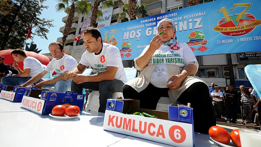 Antalya'nın Kumluca ilçesindeki 17. Tarım ve Seracılık Festivali'nde düzenlenen yarışmada katılımcılar, en fazla acı biberi yemek için mücadele etti.
