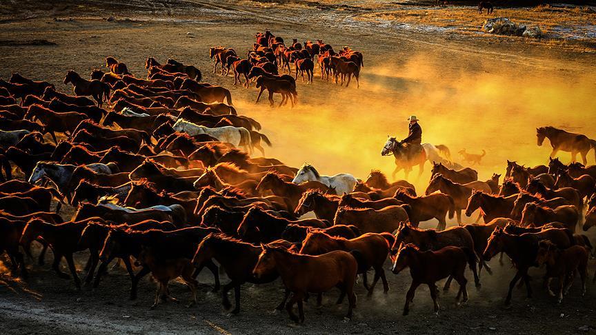 Fotoğrafçılar, sürü halinde koşan atların tozu dumana kattığı yollarda, gün batımının kızıllığıyla birlikte ortaya çıkan eşsiz manzaraları ölümsüzleştirmek için çaba sarf ediyor.